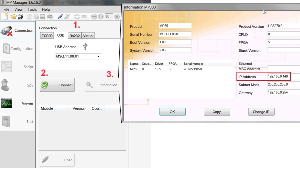 3. Click on the “Information” button. A window will pop up giving details of the MP65 device. Copy the IP address listed (In this case, 192.168.0.140).